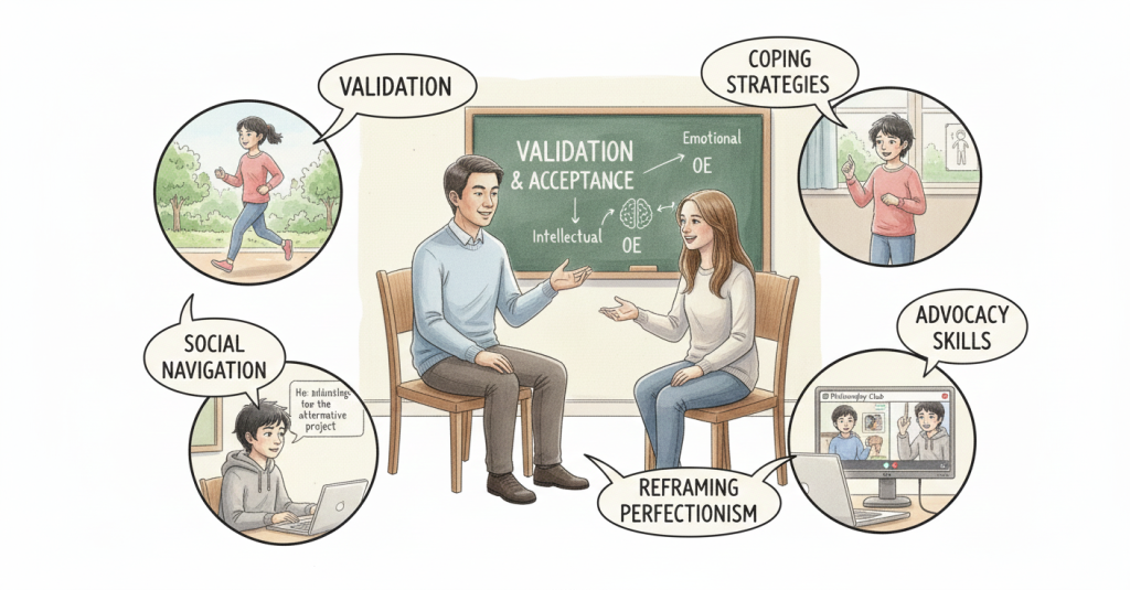 1. Validation and Self-Acceptance: Helping the student recognize that their intensities and complexities are part of their normal neurotype, reducing the self-criticism and shame associated with feeling different.